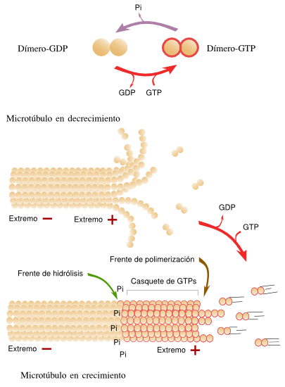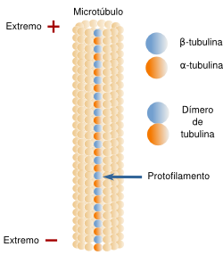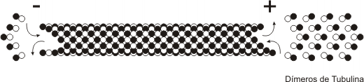 Los microtúbulos al igual que los filamentos de actina, presentan polaridad: se alargan o polimerizan agregando dímeros de tubulina en uno de sus extremos (extremo positivo), mientras que por el otro se acortan o despolimerizan eliminando dímeros (extremo negativo).