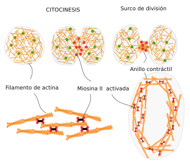 - Formación del anillo contráctil durante la división del citoplasma (citocinesis) en la división celular de las células animales. El estrangulamiento final del citoplasma durante el proceso de división celular se produce gracias a un anillo de actina, que, ayudado por la miosinas, va estrechando su diámetro progresivamente hasta la separación completa de los dos citoplasmas de las células hijas.