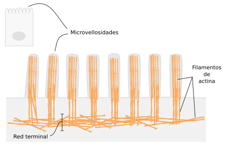 - Formación de las microvellosidades intestinales: Las microvellosidades son estructuras estables que permiten a la célula aumentar enormemente la superficie de su membrana plasmática y aparecen en las células epiteliales como las del tubo digestivo, donde se aumenta enormemente la superficie de absorción.