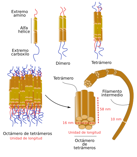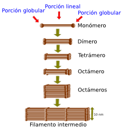 Esquema del ensamblaje de los filamentos intermedios a partir de monómeros.