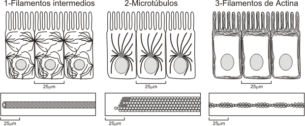 Distribución de los diferentes tipos de componentes del citoesqueleto en la célula