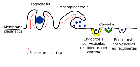 - Participación en los procesos de endocitosis, fagocitosis: La formación y escisión de vesículas en la membrana plasmática no se realiza si se impide la polimerización de los filamentos de actina. La emisión de las expansiones celulares que engloban a las moléculas que van a ser fagocitadas dependen de la polimerización de de filamentos de actina.