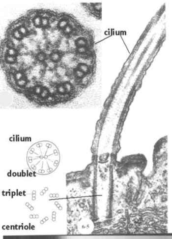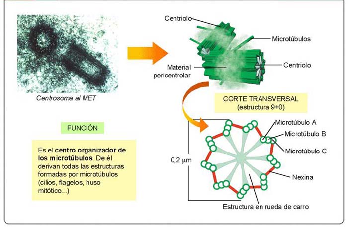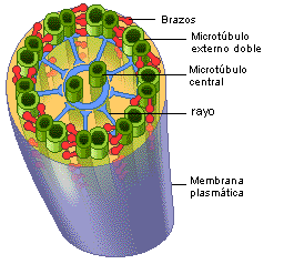 Estructura cilíndrica (9×3): 9 tripletes periféricos de microtúbulos, 0,2 µm de Ø. Unidos entre sí: nexina. Fibras radiales, en la cara cercana al núcleo: estructura de tipo "rueda de carro".