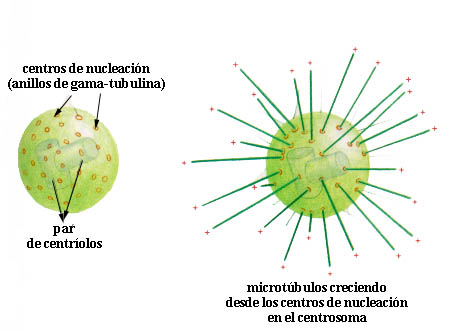 El material pericentriolar posee cientos de anillos de y-tubulina: formación de microtúbulos que crecen (+) en disposición radial.