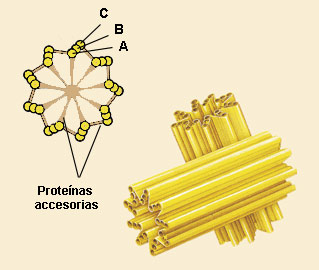 Microtúbulo A: Es el más próximo al centro del cilindro, tiene sección circular y está compuesto por 13 protofilamentos. Cada protofilamento formado por la asociación longitudinal de heterodímeros de tubulina (alfa y beta)