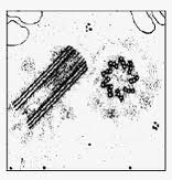 (a) Corte transversal de un centrosoma o cuerpo basal con su estructura típica, "[(9x3)+0]". Nueve tripletes periféricos y ninguno en el centro. Cada triplete esta formado por tres microtúbulos.
