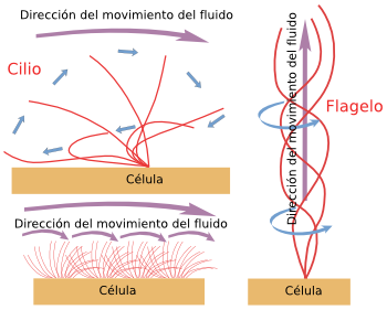 Algunas células tienen prolongaciones móviles localizadas en su superficie que les permiten desplazarse en el entorno acuoso en que viven. Estas prolongaciones se denominan cilios si existen en gran número y son de pequeño tamaño, o flagelos si tienen una longitud similar o superior a la de la propia célula, apareciendo en este caso sólo uno o a lo sumo algunos de ellos.