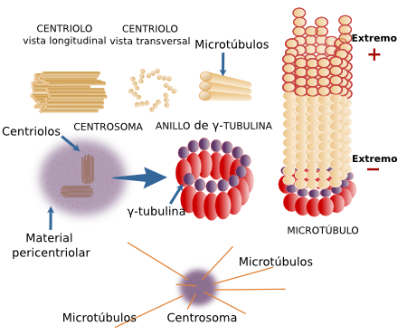 El sistema de microtúbulos de las células animales se forma principalmente a partir del centrosoma, que contiene un par de centriolos dispuestos perpendicularmente rodeados por el material pericentriolar. En ella se encuentran los anillos de γ-tubulina a partir de los cuales polimerizan los microtúbulos.