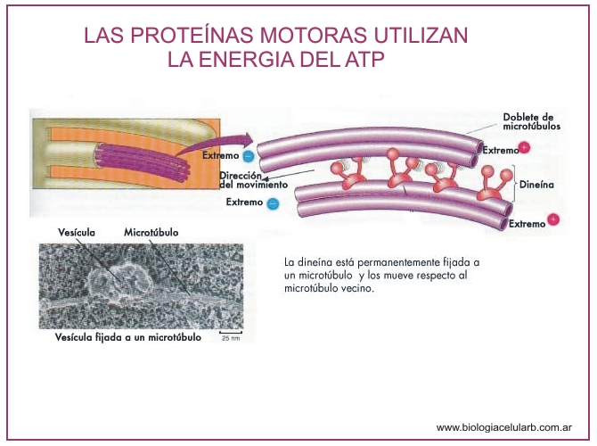 El microtúbulo A presenta dos expansiones o brazos formados por la proteína dineína, con actividad ATPásica. La hidrólisis del ATP por acción de esta proteína aporta la energía necesaria para el movimiento ciliar o flagelar.