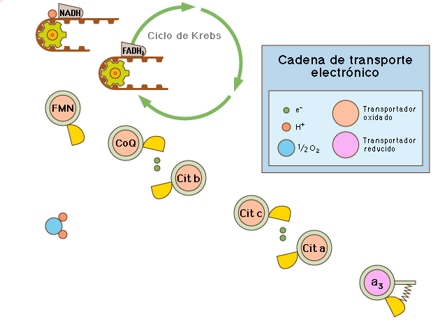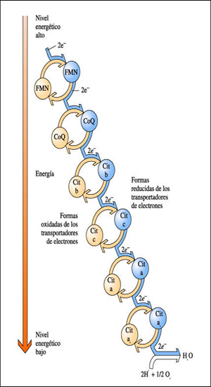 En esta representación de la cadena respiratoria, las moléculas que se indican: flavina mononucleótido (FMN), coenzima Q (CoQ) y los citocromos b, c, a y a3, son los principales transportadores de electrones de la cadena. Al menos otras nueve moléculas transportadoras funcionan como intermediarias además de las que se muestran aquí.