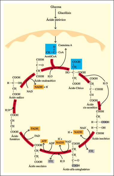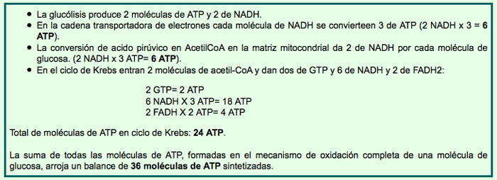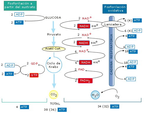 Así, el balance para una molécula de glucosa que se convierte en 2 piruvatos, luego en 2 Acetil-CoA y luego a CO2 en la vía el ciclo de los ácidos tricarboxílicos, con todo el NADH y el FADH convertidos en ATP por la cadena de transporte electrónico: