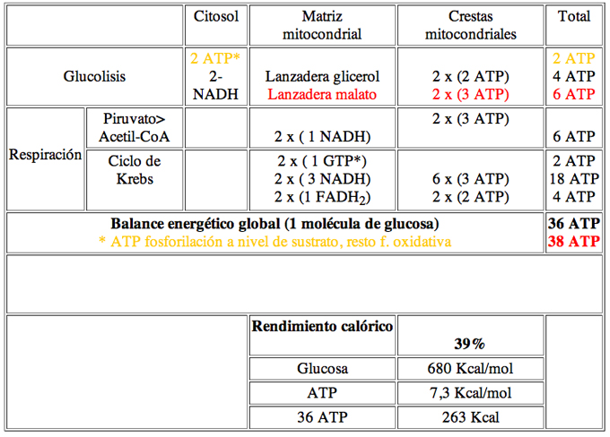 Una vez entendido y explicado el proceso completo de la respiración celular podemos hacer un balance total del rendimiento obtenido por cada molécula de glucosa.