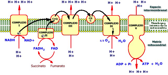 Y por cada FADH2 que llega a la cadena de transporte electrónico, como cede los electrones a un componente de la cadena posterior (complejo II), solo se producen 6 H+ (4 y 2 H+).