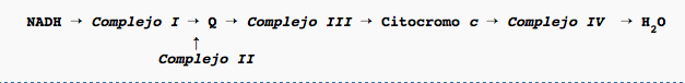 - A la cadena respiratoria también se puede acceder “lateralmente” mediante el complejo II, que utiliza el FADH2, cuyos electrones entran en la cadena, en un nivel energético ligeramente inferior a los del NADH.