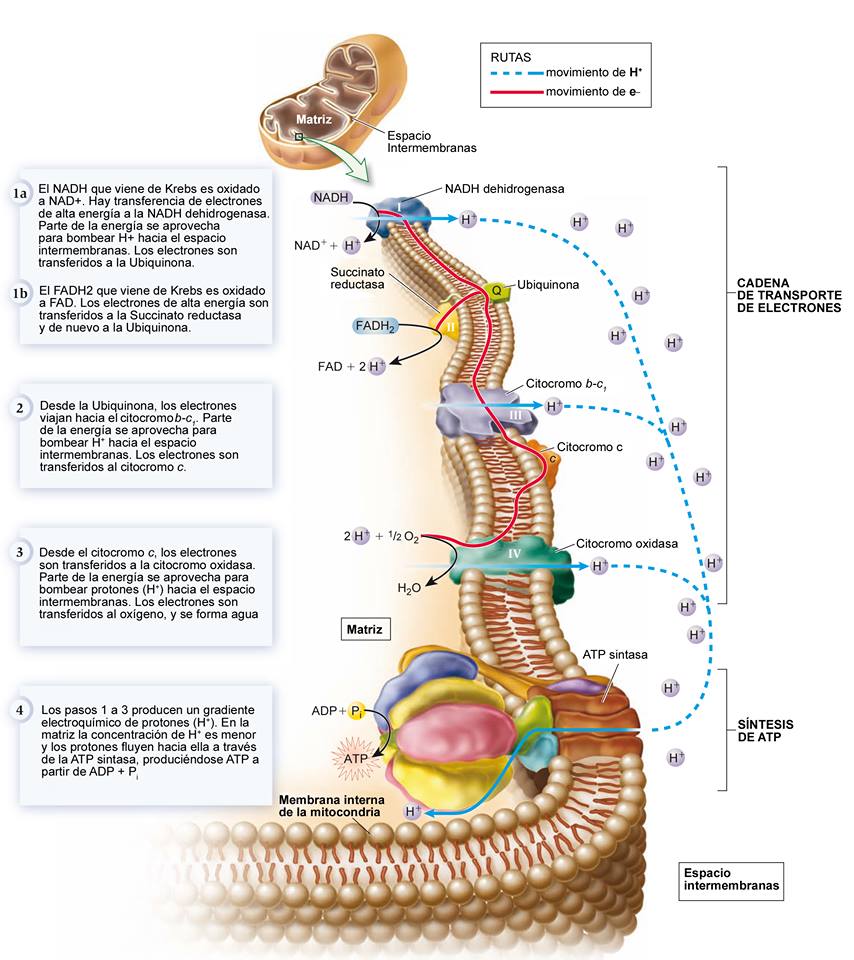Los electrones que entran en la cadena respiratoria proceden de los NADH y FADH2 que, al cederlos junto con los protones (H+), pasan a ser las coenzimas oxidadas NAD+ y FAD, respectivamente.