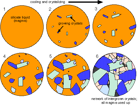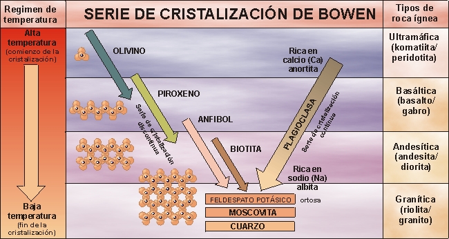 Los minerales van cristalizando en el interior del magma desde el punto de fusión más alto (olivino) hasta el punto de fusión más bajo (cuarzo). A medida que el magma se enfría y los minerales cristalizados se empiezan a separar, el magma se empobrece en olivino y piroxenos y se enriquece en sílice (cuarzo)