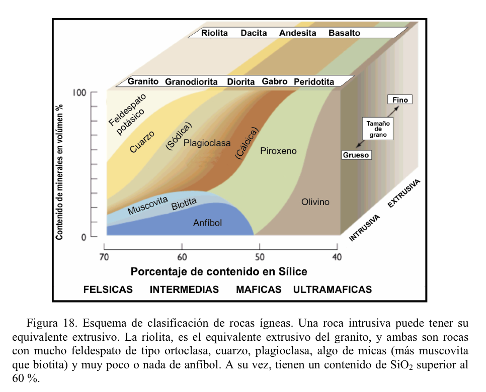 Vamos a ver una sencilla clasificación de rocas a partir de su composición mineralógica y su contenido en sílice (SiO2), su origen y su textura