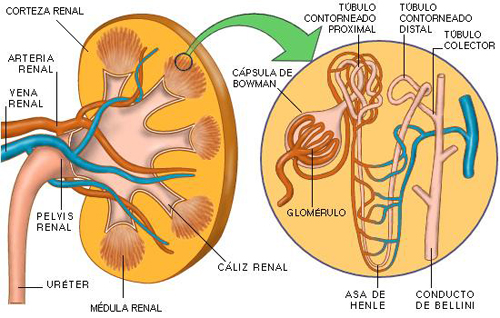 La sangre entra en los riñones para que las nefronas vayan retirando los productos de desecho y el exceso de sales y formen la orina.