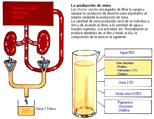 - productos de desecho, principalmente urea y en menor proporción ácido úrico y creatinina.