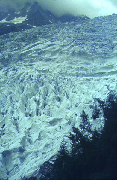 Glaciar -------------------- Pueden observarse las grietas transversales , oblicuas y longitudinales producidas por el cambio de pendiente y las desigualdades del fondo. Por encima de las sombras de los abetos, se observan tres escaladores que nos pueden servir para comparar el tamaño de las grietas. Glaciar de Bossons. Alpes franceses. |