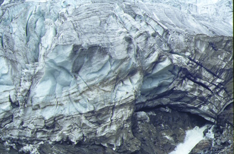 Corte de la lengua del glaciar. Se aprecian las sucesivas capas de