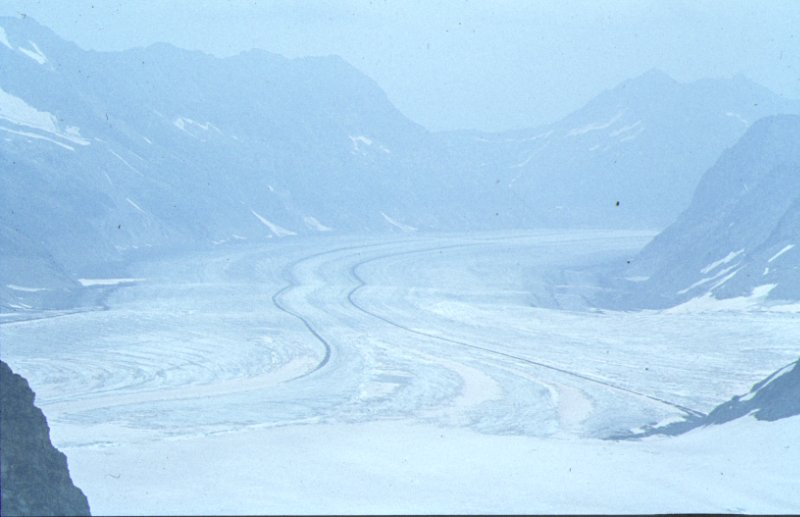 Lengua principal ( 24 Km. de longitud).Las líneas oscuras, morrenas centrales, se producen al confluir las morrenas laterales que dos lenguas. Se observan perfectamente las líneas convexas que indican mayor velocidad del hielo en el centro de la lengua. Glaciar de Aletsch. Alpes suizos. |