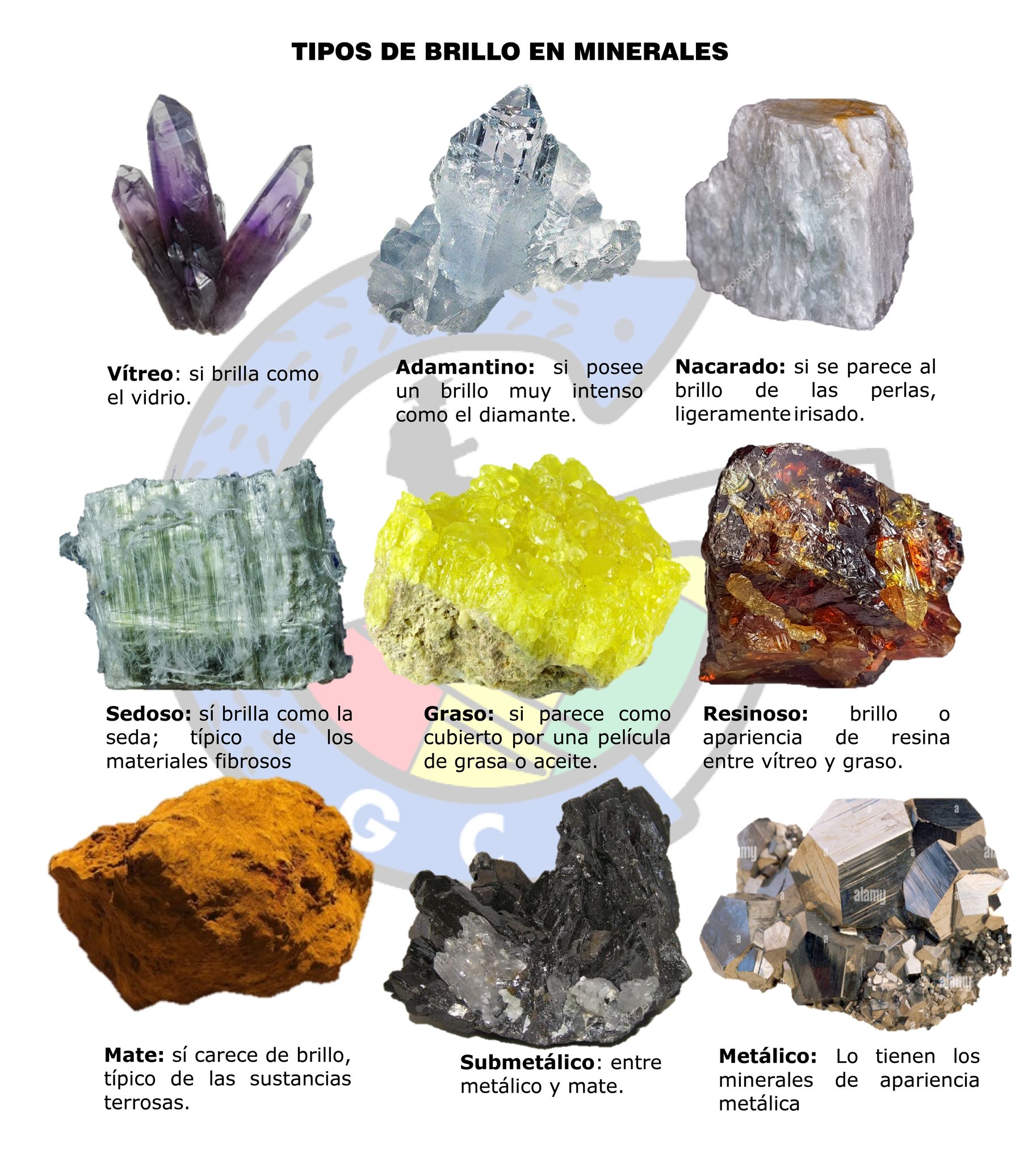 Otros minerales poseen un brillo no metálico (vítreo, nacarado o perlado, sedoso, resinoso, adamantino, céreo o graso y terroso = mate)