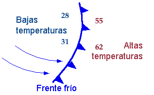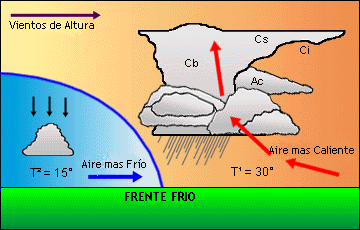Frente Frío. Se produce cuando una masa de aire frío avanza hacia latitudes menores y su borde delantero se introduce como una cuña entre el suelo y el aire caliente. En los frentes fríos la masa de aire empuja a la otra masa caliente que la hace elevarse enérgicamente. Esta drástica ascensión origina normalmente nubosidad cumuliforme de desarrollo vertical (Sc, Cu, Cb) las cuales podrían provocar chubascos o nevadas si la temperatura es muy baja. Durante su desplazamiento la masa de aire que viene desplazando el aire más cálido provoca descensos rápidos en las temperaturas de la región por donde pasa.