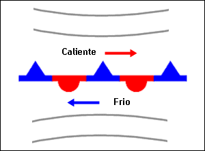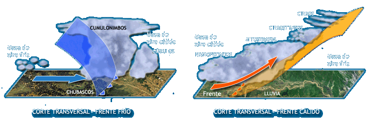 Los frentes se forman cuando se encuentran dos masas de aire de distinta temperatura. Debido a que el aire caliente es más ligero que el frío, el primero asciende sobre la capa fría.