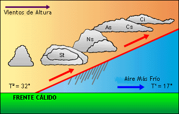 Frente Cálido. En el frente cálido este por tener una masa de aire con mayor temperatura asciende por la suave rampa que forma el frente frío, este ascenso suave forma nubes estratiformes formando bancos y capas dando lugar a lluvias. Si hay humedad suficiente se observan todos los géneros de nubes estratiformes (St, Sc, Ns, As, Cs) las cuáles podrían provocar precipitaciones de tipo continuo.