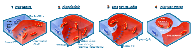 La formación de los frentes se llama frontogénesis y el proceso inverso se llama frontolisis y se clasifican en frentes fríos, cálidos o calientes estacionarios y ocluidos.