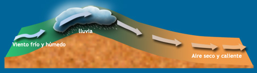 De tipo orográfico, cuando el aire caliente y húmedo remonta una cadena montañosa, se enfría y da lugar a precipitación en la ladera de barlovento, llegando a la ladera de sotavento el viento seco. A este fenómeno se le llama efecto Föehn.