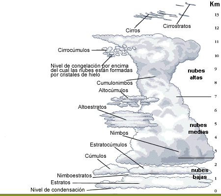 Estratocúmulos, Cumulonimbos. Lo normal es que aparezcan nubes con características intermedias, como éstas o los cirroestratos, altoestratos,...
