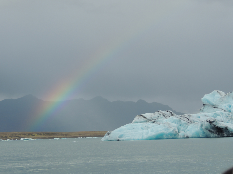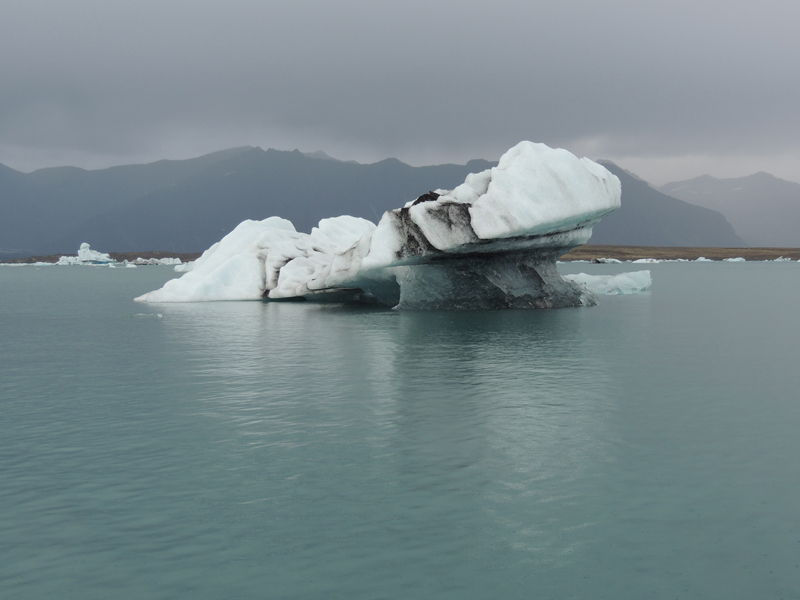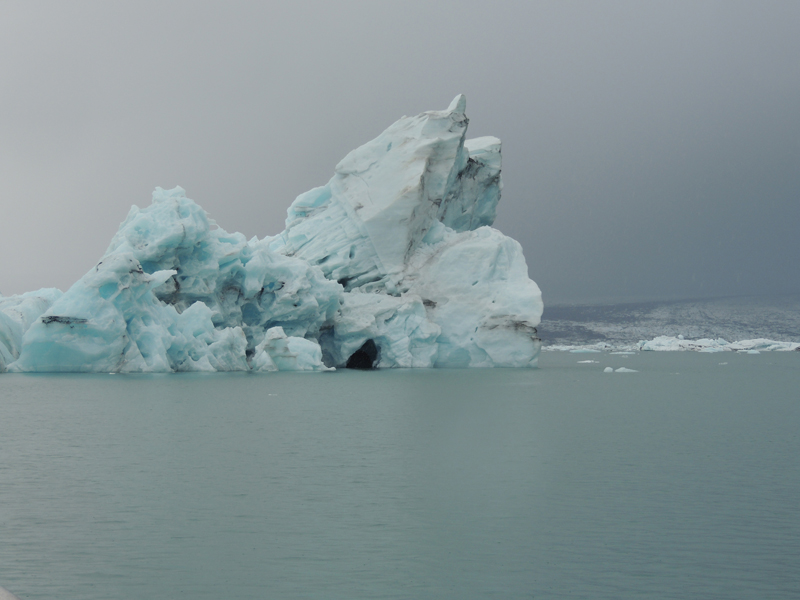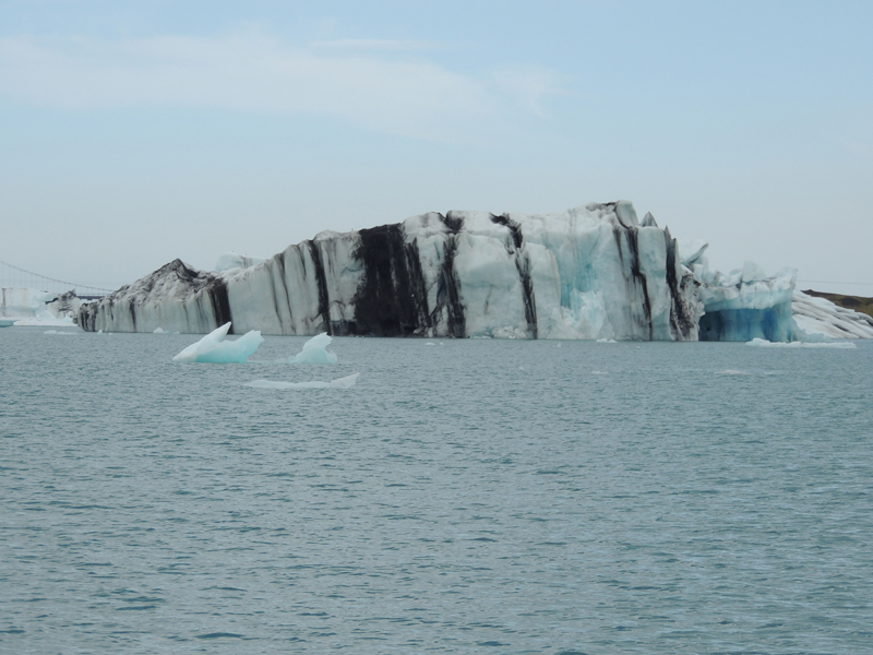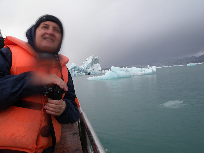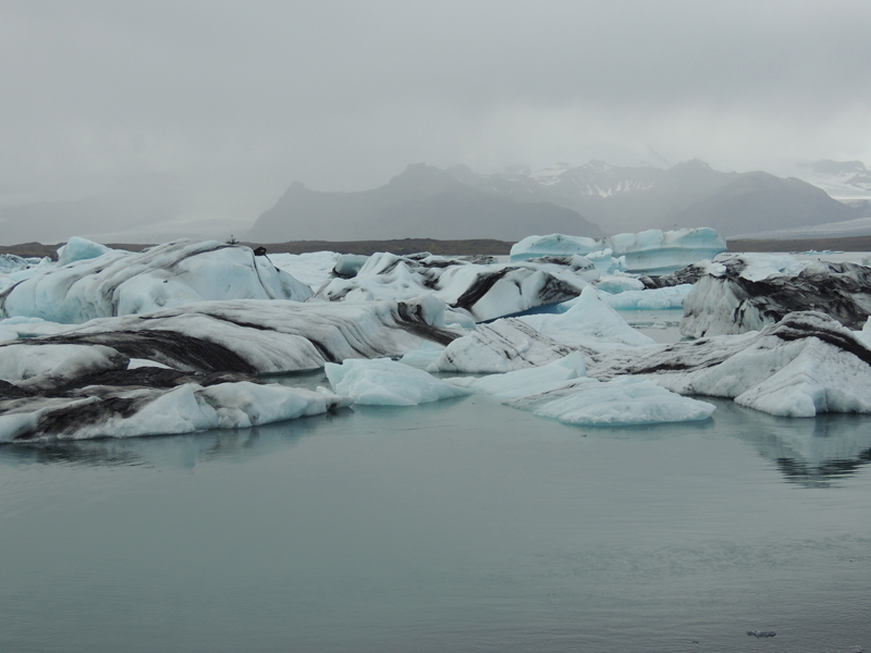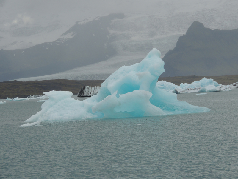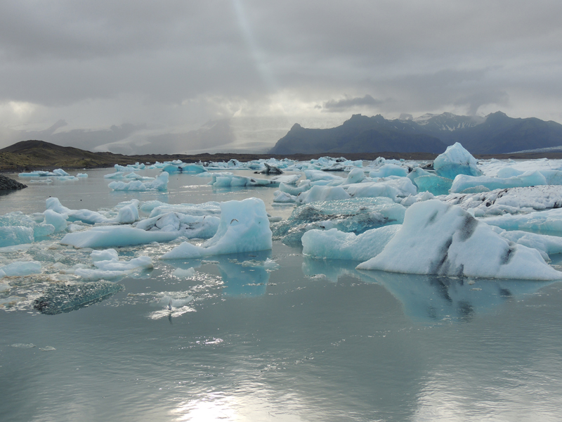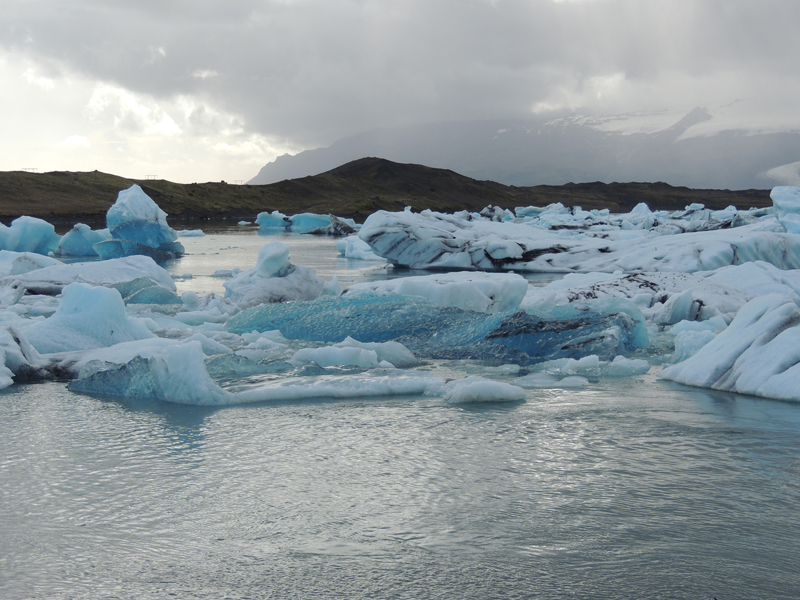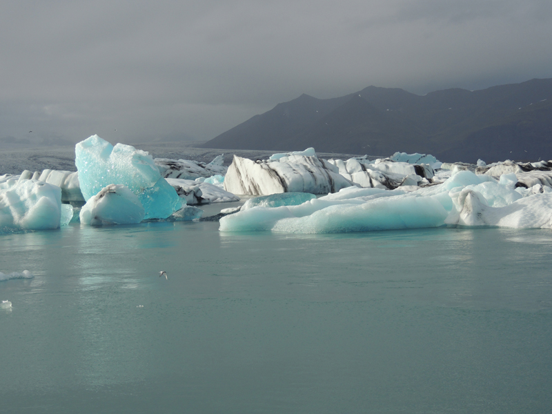 Laguna glaciar con icebergs. Al fondo, las lenguas glaciares que los originan