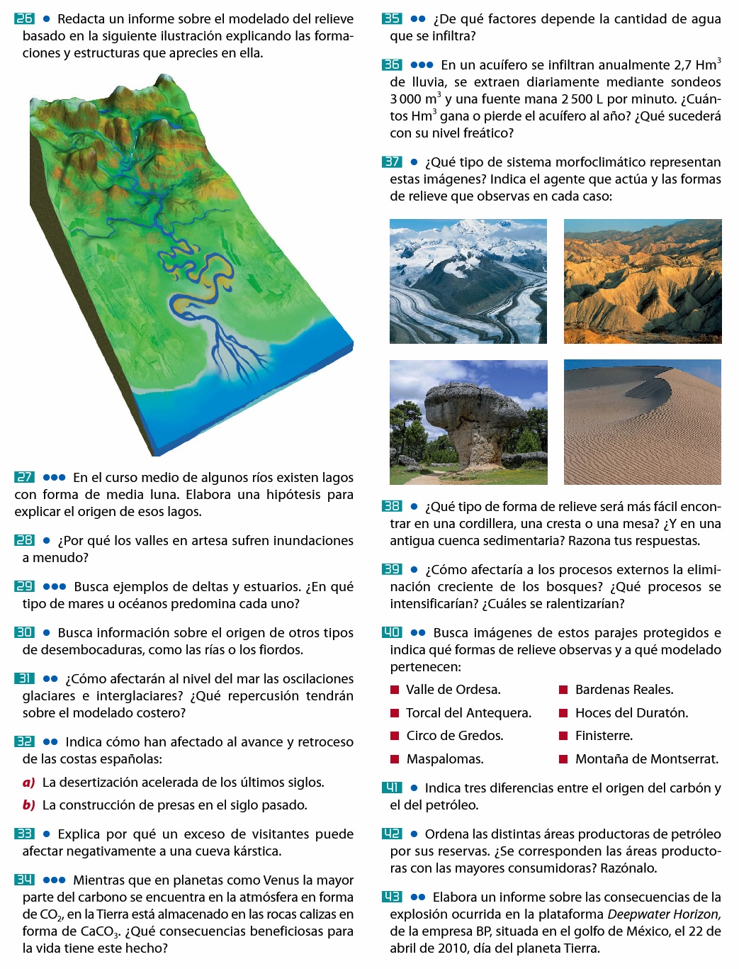 A continuación aparecen varias fotografías relativas al modelado del relieve. Realiza una descripción y ofrece una explicación razonada de cada una de ellas que incluya el agente geológico que lo ha originado, así como aquellos factores que pueden haber influido o tener relevancia en dicho modelado.