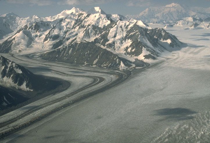 La morrena lateral (mancha oscura) pasa a ser central después de unirse ambos glaciares.