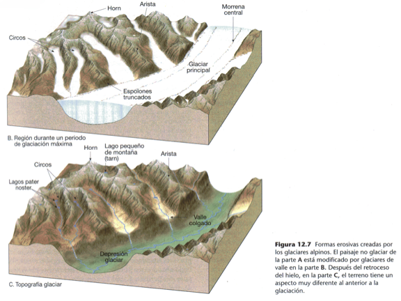 Además de lo visto, el glaciarismo produce crestas sinuosas de bordes agudos denominadas aristas y picos piramidales agudos denominados horns, que se proyectan sobre los alrededores.