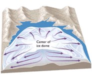 masas de hielo fluyen en todas las direcciones desde uno o más centros