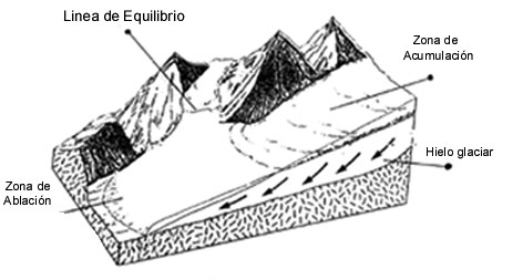 Por encima del límite, en la zona de acumulación, la adición de nieve aumenta el espesor del glaciar y propicia su movimiento.