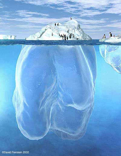 Este proceso genera icebergs en los lugares donde el glaciar alcanza el mar o un lago. Como los icebergs son ligeramente menos densos que el agua, flotan muy hundidos, con más del 80% de su masa bajo el agua).