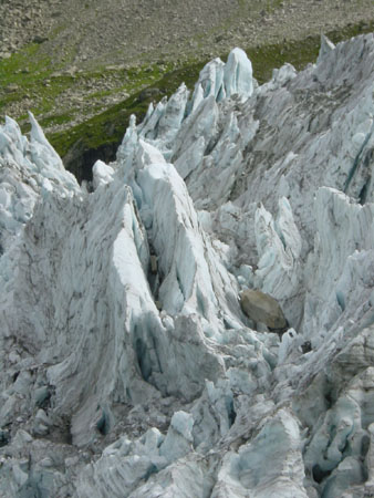 Cuando el glaciar se mueve por un terreno irregular, la zona de fractura sujeta a tensión provoca hendiduras denominadas grietas (pueden tener hasta 50 metros de profundidad. A más profundidad, el flujo plástico las sella)